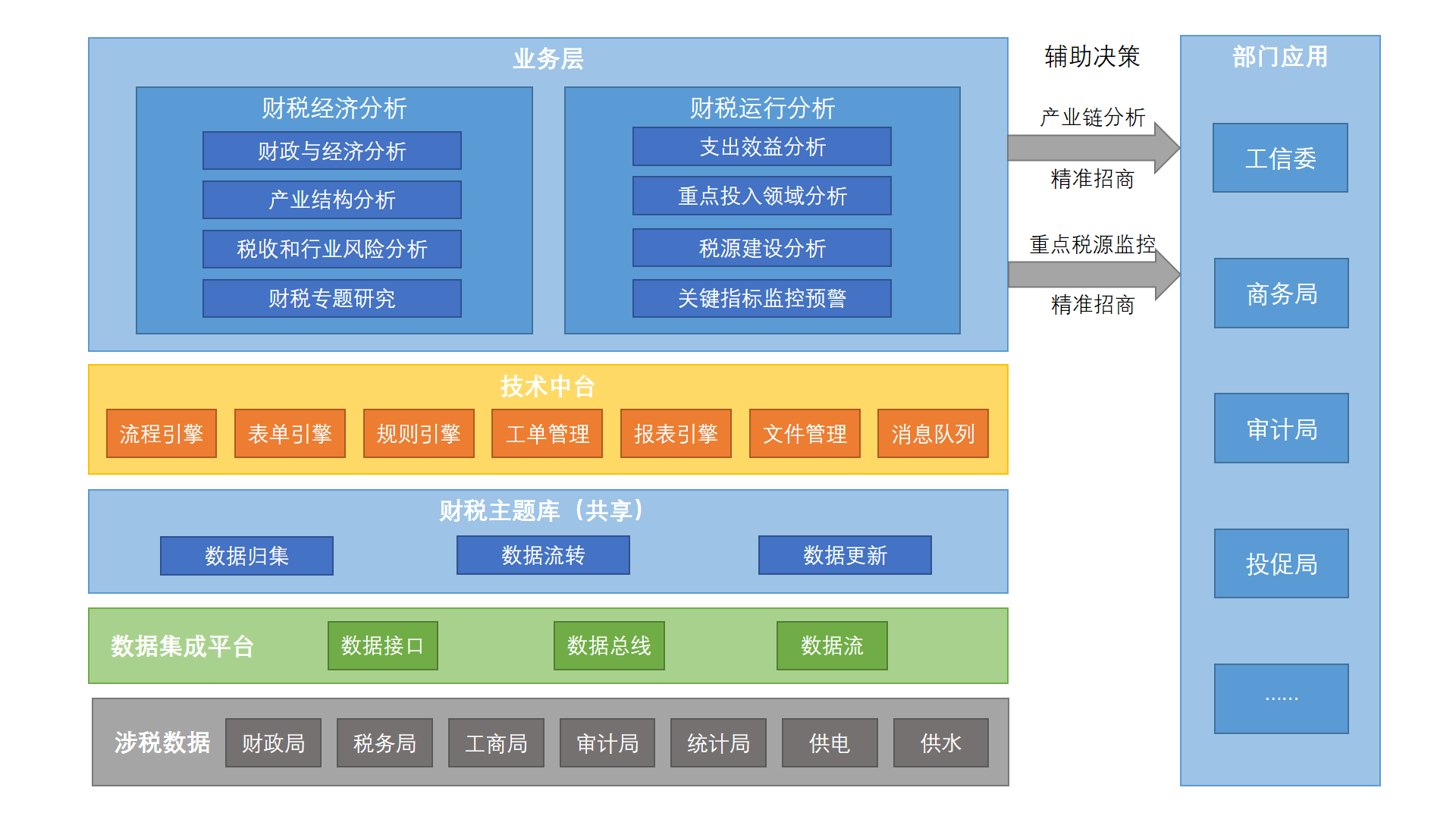 建立统一的标准与规范,以企业级为最小颗粒度整合收入数据,帮助政府财政及相关部门探究经济、产业对财政收入的影响,从而精准